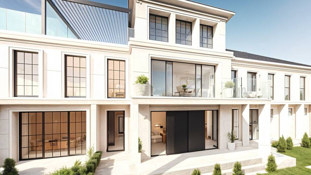 Diese exklusive Residenz besticht durch ihre zeitlos-klassische Architektur mit modernen Akzenten. Die stilvolle Fassadengestaltung wird durch symmetrisch angeordnete, bodentiefe Fenster mit feinen Sprossen stilvoll betont. Großzügige Fensterflächen durchfluten die Innenräume mit Tageslicht und schaffen eine warme, einladende Atmosphäre.