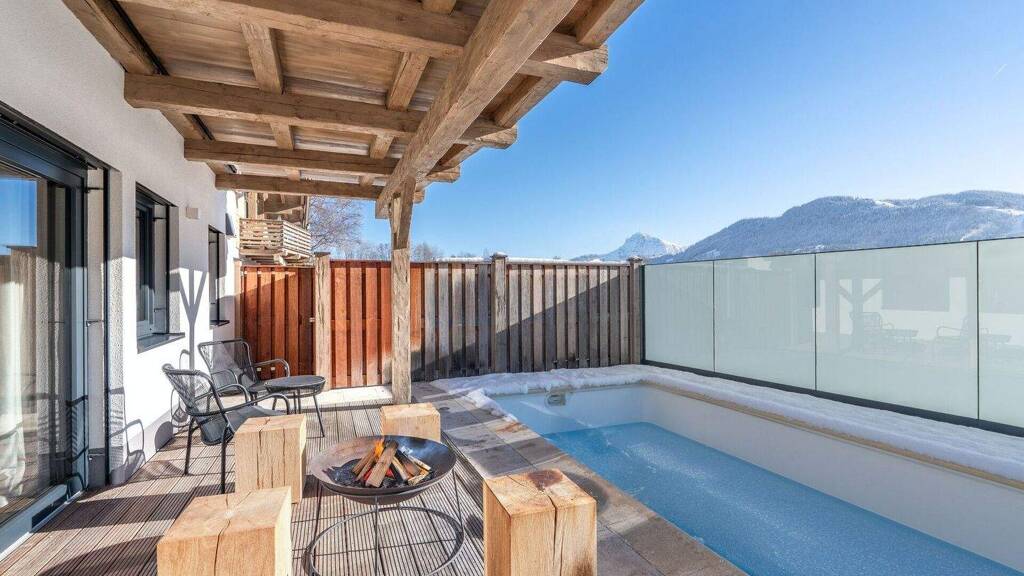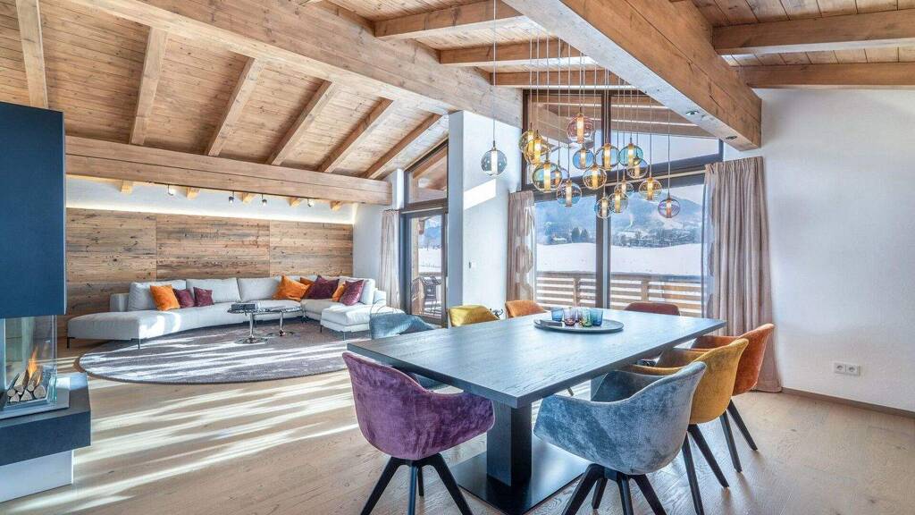 Das Obergeschoss ist dem Wohnen gewidmet und beeindruckt durch seine Großzügigkeit. Der offene Wohn- & Essbereich wird durch edle Tischler-Altholzeinbauten und einen eindrucksvollen Sichtdachstuhl geprägt, die dem Raum eine warme, alpine Eleganz verleihen. Die moderne Küche ist mit hochwertigen Bosch-Geräten ausgestattet und verbindet Design mit Funktionalität. Ein angrenzender Arbeitsbereich, der sich optional in ein weiteres Schlafzimmer verwandeln lässt, bietet maximale Flexibilität. Sowohl der Arbeitsbereich als auch die Küche öffnen sich zum Nordbalkon, der einen traumhaften Blick auf den Wilden Kaiser bietet. Der Wohnbereich selbst führt auf den großzügigen Südbalkon, von dem aus sich ein unverstellter Ausblick auf die Berge und das Kitzbüheler Horn eröffnet.