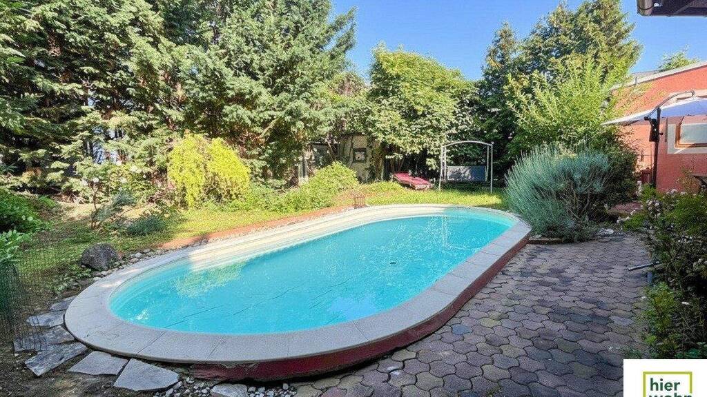Ihre private Bade-Oase: Eingebettet, fast wie bei einer Waldlichtung, bildet der Swimmingpool mit einer Größe von 7,37 x 3,60 das Herzstück des Gartens und bietet herrliche Abkühlung an heißen Sommertagen-hier genießen Sie den Sommer in vollen Zügen.