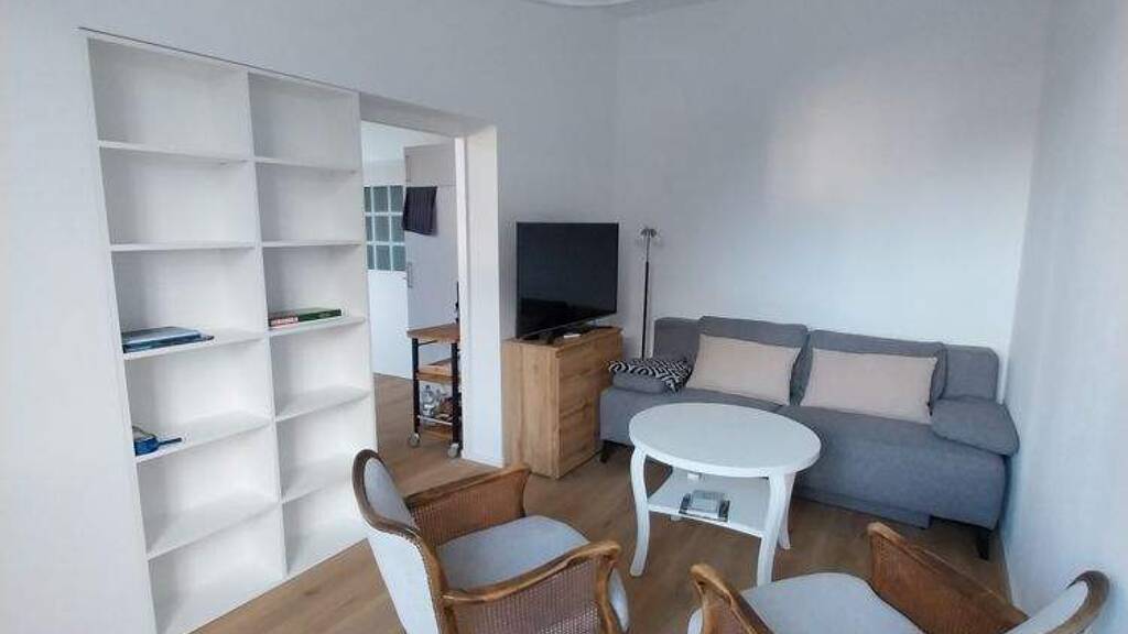 Die gemütliche Zweizimmerwohnung hat einen großen Eingangsbereich in dem auch die kleine gut bestückte Einbauküche untergebracht ist. Der Wohnraum ist etwas abgetrennt und hat eine praktische Regalwand, in welcher Sie Ihr Inventar gut unterbringen können.