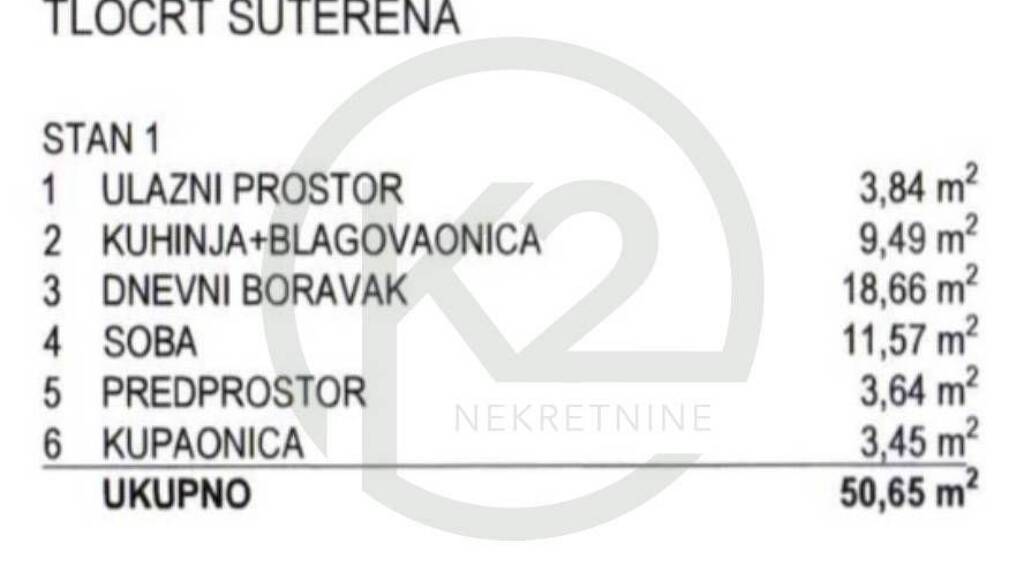 STAN U PRIZEMLJU vel. 50,65 m2 sastoji se od: kuhinje s dnevnim boravkom, roditeljske sobe, kupaone i manje prostorije raznih namjena.