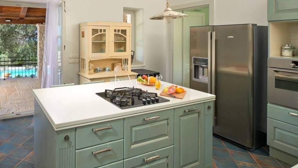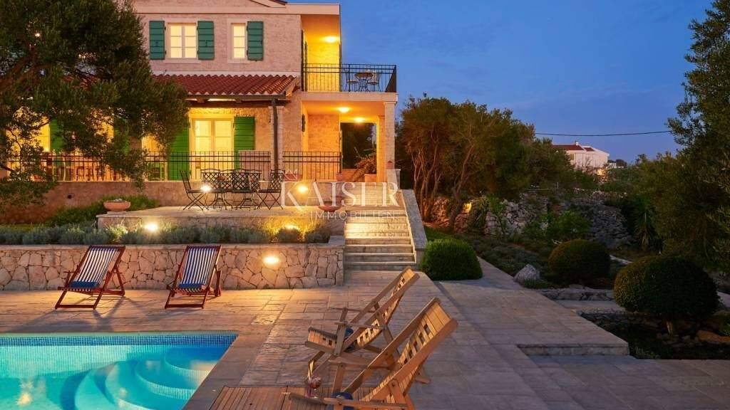 Kaiser Immobilien bietet diese luxuriöse, einzigartige, charmante Villa mit privatem Pool in Lun auf der Insel Pag, nur 250 m vom Meer und wunderschönen Stränden entfernt und umgeben von den Düften der Natur. Die Stadt Lun liegt im äußersten Nordwesten der Insel Pag. Aufgrund des milden mediterranen Klimas und der entspannenden Ruhe ist es ein idealer Ort für einen Urlaub. Es ist bekannt für seine einzigartigen Olivenhaine, die seit tausend Jahren erhalten sind und 1963 zum botanischen Reservat erklärt wurden. Diese wilden Olivenbäume, umgeben von Felsen und Meer, widerstehen seit Jahren dem harten Sturm. Das Entspannen im Schatten dieser tausendjährigen Bäume zieht viele Menschen nach Lun, deshalb empfehlen wir in unserem Angebot auf jeden Fall diese Schönheit, die sich auf einem geschlossenen Grundstück mit einer Fläche von 4000 m2 befindet, während die Villa selbst hat eine Fläche von 290 m2 und erstreckt sich über 2 Etagen, Erdgeschoss und Obergeschoss. Diese private Villa mit Außenpool ist von alten Olivenbäumen umgeben, die das Hauptmerkmal des historischen Dorfes Lun sind, und seine landschaftlich gestalteten Gehwege bieten das Vergnügen langer Spaziergänge oder Radtouren. Dank des großen Gartens haben die Gäste dank der renovierten Trockenmauer, die ihn umgibt, Privatsphäre garantiert. Auf der Oberfläche des Gartens befinden sich jahrhundertealte Olivenbäume sowie ein Olivenhain mit jungen Oliven. Außerdem ist diese zu vermietende Villa von zahlreichen anderen mediterranen Pflanzen umgeben: Pinien, Zypressen, Oleander, Lavendel, Rosmarin, Lorbeer, Immortelle... Ein schöner, weitläufiger Garten, ausgestattet mit einem Swimmingpool (15 x 5 m), der von Liegestühlen umgeben ist und eine Außendusche sorgen für unvergessliche Momente der Entspannung mit Sonne und unberührter Natur. Neben dem Pool befindet sich ein überdachter Teil des Hofes, wo sich ein Esstisch für 10 Personen befindet, an dem Sie Ihre Mahlzeiten mit hausgemachtem Pager Öl würzen können. Vom Innenhof aus betreten Sie das Erdgeschoss, wo Sie zunächst eine voll ausgestattete Küche und ein Wohnzimmer mit Innenkamin finden. Dieser gesamte Raum hat direkten Zugang zur Terrasse. Die Treppe führt in den ersten Stock, wo sich Schlafzimmer befinden, die Zugang zum Balkon haben, wo es einen Platz zum Sitzen und Genießen des ersten Morgenkaffees und der ersten Sonnenstrahlen gibt. Die Entfernung der Villa vom Meer beträgt 250 m und vom Stadtzentrum 1 km. Aufgrund seiner Eigenschaften gehört es zu Recht zu exklusiven Immobilien und ist als solches ein echter Wert auf dem Markt und wartet stolz auf seinen Käufer. Für weitere Informationen steht Agentin Vanja unter 0915231376 zur Verfügung