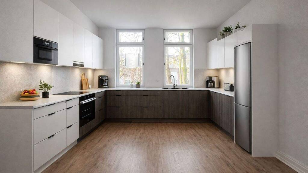Edle Vinylböden in Holzoptik, verbunden mit hohen Decken und großen Fensterelementen sowie hochwertige Fensterbänke aus belgischem Granit, verleihen dieser Wohnung ein besonderes Ambiente.