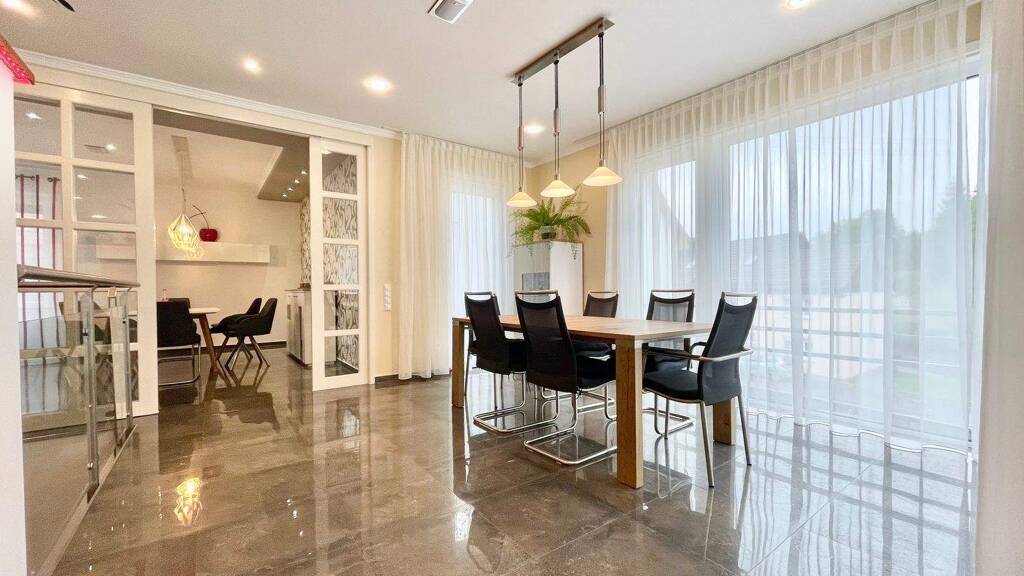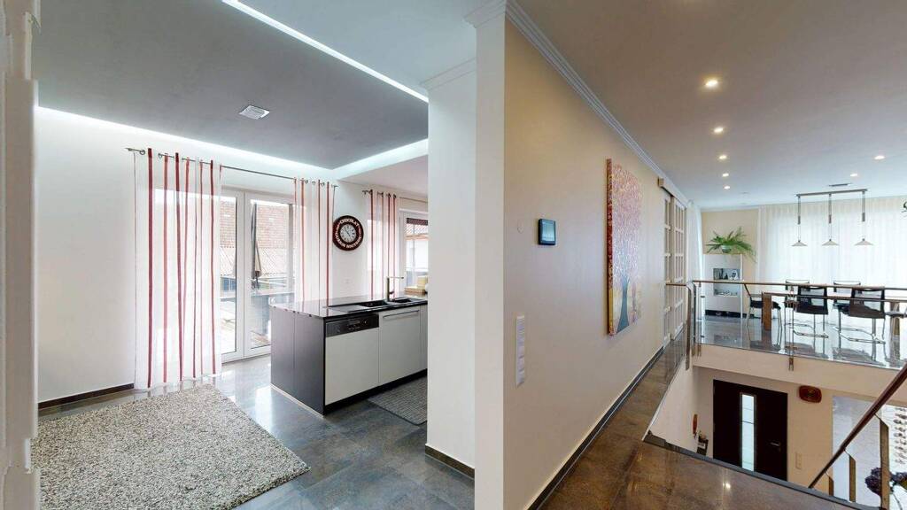 Obergeschoss: . Offenes Wohnkonzept mit ca. 53 m² Wohnbereich und Zugang zur Sonnenterrasse . Designerküche von Schüller mit Natursteinplatte und Home-Connect-Geräten . Schlafzimmer mit Zugang zur Poolterrasse . Bad mit Sauna, großer Badewanne und Walk-in-Dusche