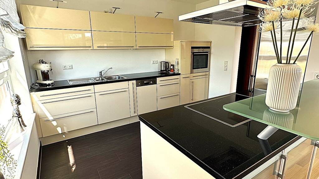 Raumaufteilung Insgesamt stehen im Hauptgebäude eine lichtdurchflutete Wohnung mit Dachterrasse, einem großzügigen offen Bereich für Kochen, Wohnen und Essen, sowie bis zu 5 weitere Zimmer (z. B. für Schlafen oder Gäste) 2 Bäder, WC und ausgebauter Spitzboden (als weitere Flächenreserve) zur Verfügung. Die Ausstattung ist hochwertig mit Parkett, Einbauküche, Parkett, elektrischen Rollos, begehbarer Wellnessdusche uvm.