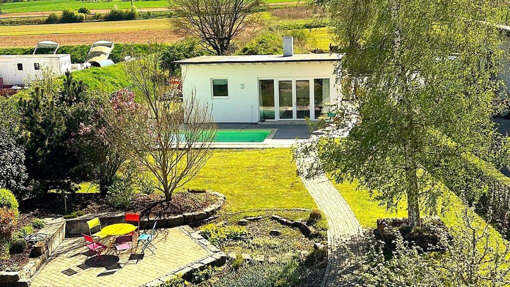 Außenanlage: Neben mehreren Terrassen und Freiflächen sind hier sehr schön angelegte Rasenflächen, Fischteich und Eingrünungen vorhanden, so dass verschiedene Sitzbereiche als Liegewiese, Terrassen und Biergarten im Außenbereich entstehen. Das beheizte Poolhaus mit ca. 40 m² Nutzfläche verfügt Rückzugsmöglichkeiten zur Entspannung und über einen unterirdischen Weinkeller und wurde 2021 errichtet. Der Salzwasserpool (3,5 m x 7,5 m) ist Baujahr 2020 und wird über eine eigene Wärmepumpe beheizt.