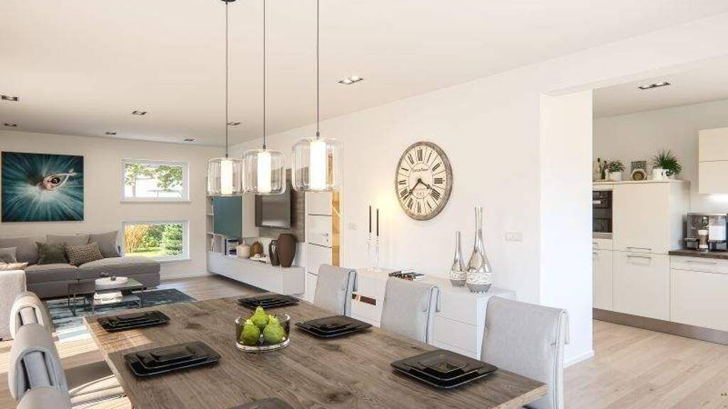 In diesem Einfamilienhaus (Life 156) wird der weite Wohn-/Essbereich mit offen angeschlossener Küche durch die Anbauteilvariante "Wohnraumerker" noch mehr vergrößert. Im Erdgeschoss findet sich außerdem noch Platz für ein Gästezimmer. Das Dachgeschoss bietet Raum für das Familienbad, die beiden Kinderzimmer und das Elternschlafzimmer mit begehbarer Ankleide in der Attika.