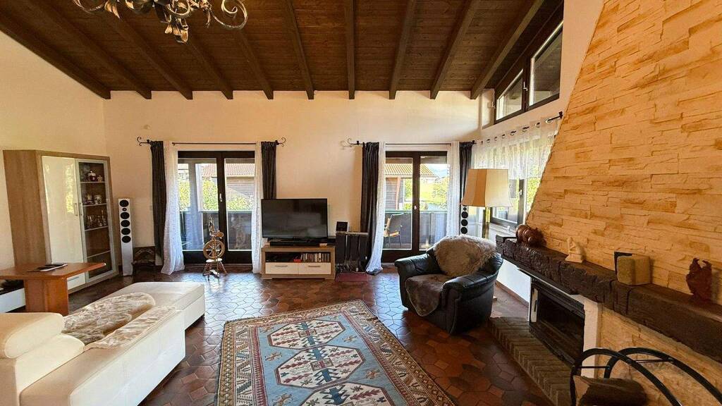 * Zwei Schlafzimmer im Erdgeschoss * Badezimmer mit Badewanne und Dusche * Separates Gäste-WC im Erdgeschoss und weiteres WC im Obergeschoss * Großzügiges Wohnzimmer mit Zugang zum Balkon * Separate Küche mit vorgelagerter Essecke * Balkon mit Bergblick * Pflegeleichter Garten mit kleinem Teich * Garage mit vorgelagertem Stellplatz * Ruhige Lage mit schöner Aussicht * Solide Bauweise
