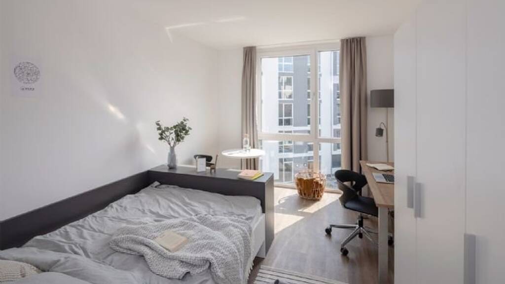 •Living and working area: bed incl. mattress, desk with chair, wardrobe with mirror, lightproof curtains, intercom and generally extra storage space