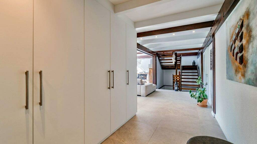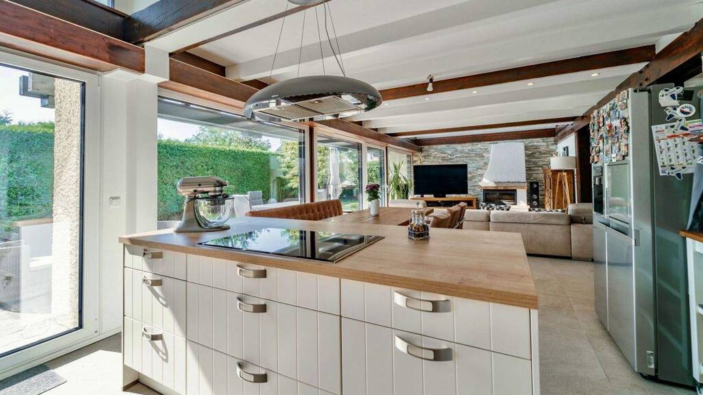 Im Erdgeschoss werden Sie von einer großzügigen Diele empfangen, die mit einem maßgefertigten Einbauschrank ausgestattet ist, sowie einem zeitgemäßen Tageslicht-WC. Der offene Wohn-Essbereich begeistert mit einer beeindruckenden Fensterfront, die den Raum mit natürlichem Licht durchflutet und einen ungestörten Blick in den idyllischen Garten ermöglicht. Die hochwertige Einbauküche mit Markengeräten bietet nicht nur Funktionalität, sondern auch einen charmanten Ausblick auf die liebevoll restaurierten Holzbalken, die den Charakter des Hauses unterstreichen. Für behagliche Abende sorgt der stilvolle Originalkamin aus 1979, der 2021 auf die neuesten energetischen Standards modernisiert wurde.