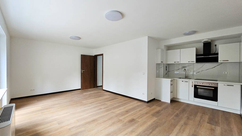 Sowohl der helle Wohnbereich als auch das Schlafzimmer führen direkt auf den großzügigen Balkon, der sich über zwei Seiten der Wohnung erstreckt - ein idealer Rückzugsort mit Blick ins Grüne. Die moderne Einbauküche ist bereits vollständig integriert und fügt sich harmonisch in den Wohnraum ein.