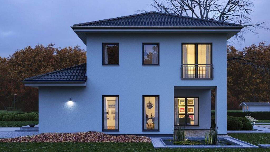 + Walmdach mit selbstreinigender Ziegeleindeckung, sturmverklammert + Dachrinnen und Fallrohre aus Titanzink + Dreifach-verglaste Wärmeschutzfenster + Außenfensterbänke aus Aluminium + Rollläden aus Aluminium + Haustür mit Edelstahlgriff und Mehrfachsicherheitsverriegelung + Freiraumupgrade auf 2,75 m Deckenhöhe im Standard + Mineralischer Struktur-Außenputz in weiß + Bodenplatte (Keller optional) inkl. Bodengutachten + Installation Luft-Wasser-Wärmepumpe mit Fußbodenheizung + Elektroinstallation + Photovoltaikanlage + Sanitärrohinstallation + Installation Be- und Entlüftungsanlage + Buchenholztreppe + Trockenbau (Dämmung + Beplankung) - Material +Grundstückskosten (sind nicht berücksichtigt) +Keller Optional +Es handelt sich hierbei um ein Exklusives Grundstück