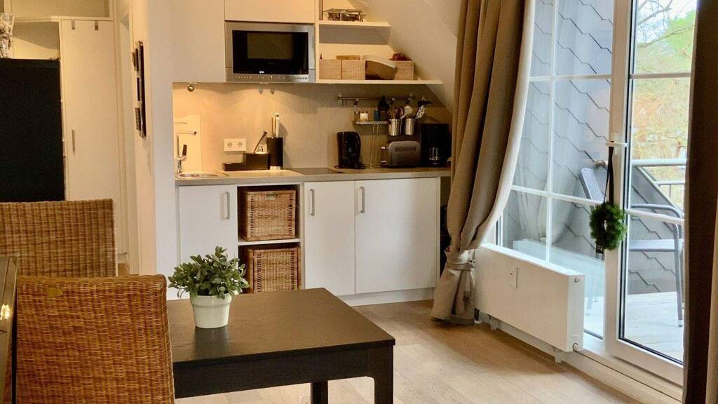 Die 30m² sind modern eingerichtet, mit offener Küchenzeile und einem geräumige Duschbad. Ein besonderes Highlight ist der südlich ausgerichtete Balkon - mit seitlichem "Wintermeerblick" auf die Ostsee.