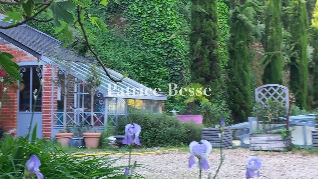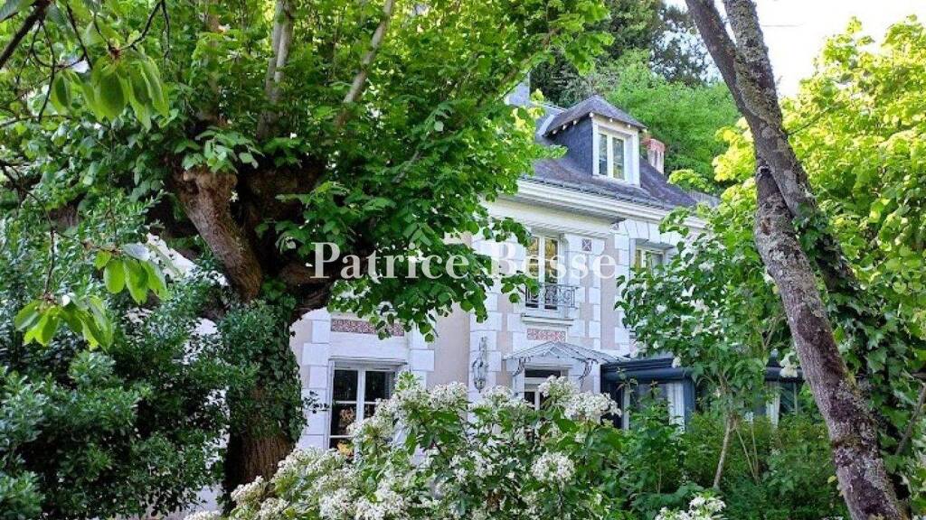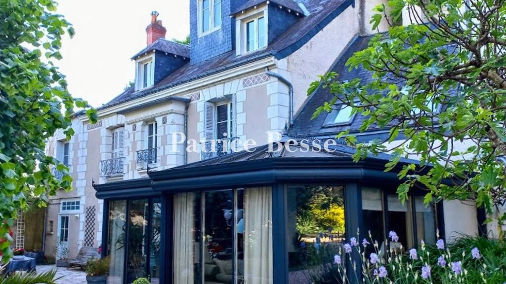 On the north bank of the Loire River, the property is located at the end of a no-through road within one of the city's peaceful neighbourhoods. Hidden by vegetation, the house, composed of several adjacent buildings, has plaster-coated exteriors decorated with cement tile friezes between its tuffeau stone window/door surrounds. With three storeys, including one under the eaves, the house's ground floor is partially carved out of the rock of the adjacent hillside, whereas, in front, an immense conservatory, effectually expanding the living room towards the outside, primarily faces a landscaped garden with a variety of different trees and perfectly maintained shrubs, as well as swaths of lawn and an ornamental pond. Last, but not least, a swimming pool is located on one side and, extending on from the dwelling, an outdoor area, covered by a slate roof, protects the entrance to the cellars and provides parking for two vehicles.