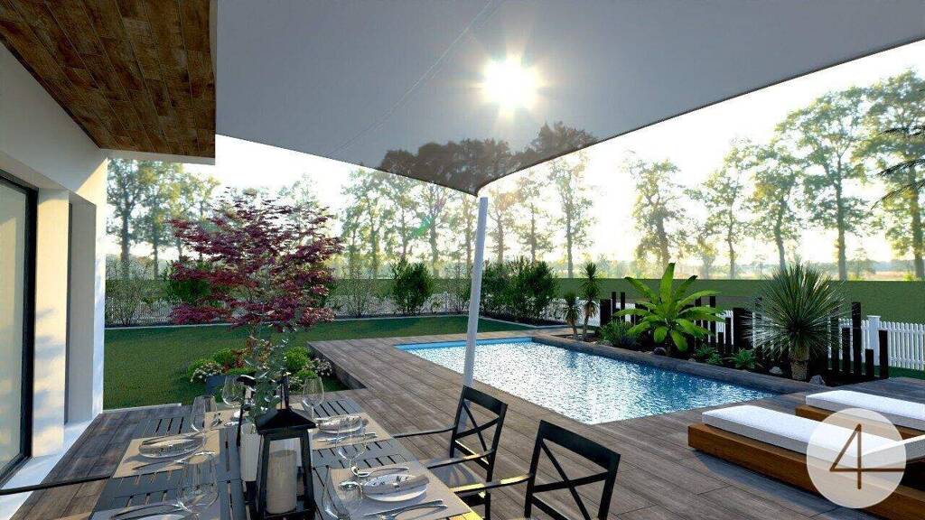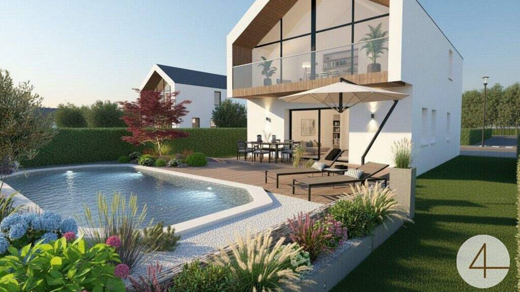 Der Planentwurf ist fertig und das Ergebnis ist wunderschön. Ein modernes Einfamilienhaus, zeitgemäße Architektur und der liebevolle Charme eines Chalets, macht die Häuser zu etwas ganz besonderen. Die Fotos sind Symbolfotos, Einrichtungsgegenstände, Pool und sowie die Bepflanzung und Dekor sind im Preis nicht inbegriffen. Der Preis bezieht sich lediglich auf das schlüsselfertige Haus inklusive Grundstück.