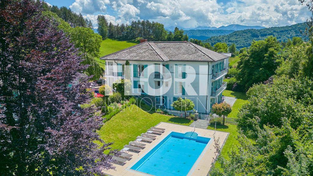 Die Liegenschaft, mit großartigem Blick auf den Wörthersee, liegt oberhalb der Pörtschacher Bucht.