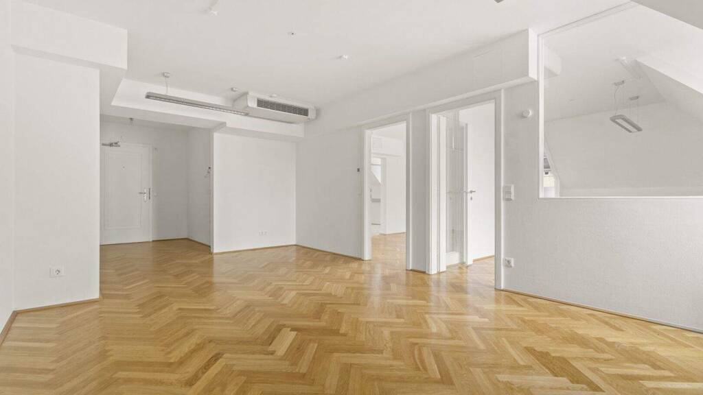 Die Räumlichkeiten im 3. Obergeschoss öffnen sich mit großzügiger Raumhöhe, edlem Fischgrätparkett und einem durchdachten Grundriss,