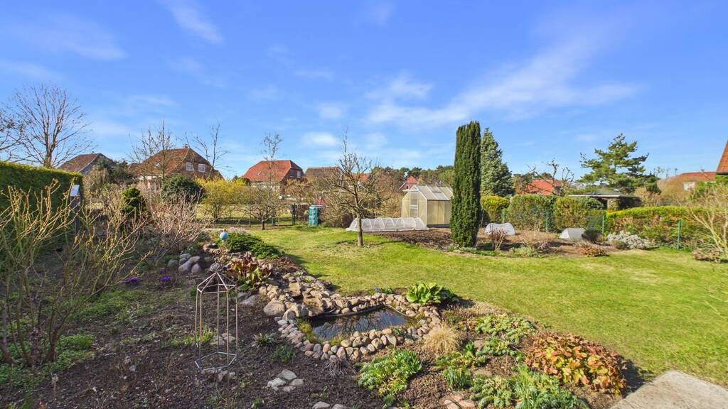 Das liebevoll angelegte Grundstück bietet eine gepflegte Gartenanlage mit kleinem Teich und Wasserlauf. Eine überdachte Terrasse mit gläsernem Windschutz erweitert den Wohnbereich nach draußen. Ein Carport sowie weitere funktionale Außenanlagen ergänzen das Angebot.