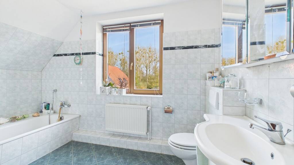 Im Dachgeschoss wurden Vinylböden im Flur und zwei der Schlafzimmer verlegt, während das große Schlafzimmer mit Teppichboden versehen ist. Das Vollbad ist klassisch grün-weiß gefliest.