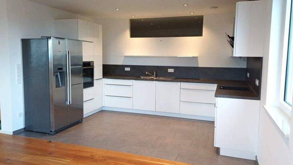 Die exklusive Einbauküche ist mit hochwertigen Elektrogeräten vollständig ausgestattet und lässt keine Wünsche offen. Das große, helle Badezimmer verfügt über Badewanne, Dusche, zwei Waschbecken sowie ein Oberlicht, das den Raum mit natürlichem Tageslicht durchflutet. Zusätzlich stehen ein separates Gäste-WC sowie Anschlüsse für Waschmaschine und Trockner zur Verfügung.