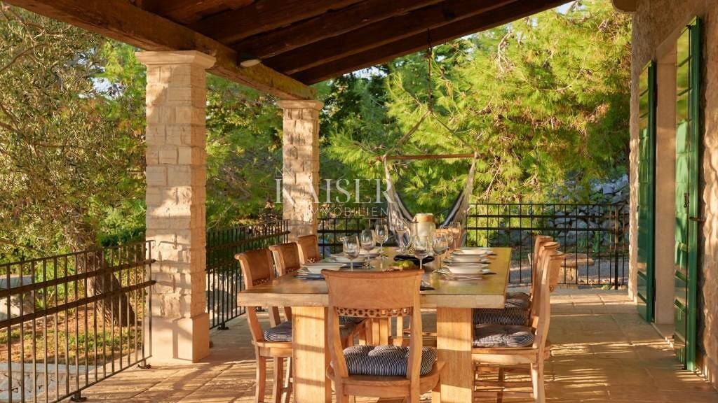 Kaiser Immobilien bietet diese luxuriöse, einzigartige, charmante Villa mit privatem Pool in Lun auf der Insel Pag, nur 250 m vom Meer und wunderschönen Stränden entfernt und umgeben von den Düften der Natur. Die Stadt Lun liegt im äußersten Nordwesten der Insel Pag. Aufgrund des milden mediterranen Klimas und der entspannenden Ruhe ist es ein idealer Ort für einen Urlaub. Es ist bekannt für seine einzigartigen Olivenhaine, die seit tausend Jahren erhalten sind und 1963 zum botanischen Reservat erklärt wurden. Diese wilden Olivenbäume, umgeben von Felsen und Meer, widerstehen seit Jahren dem harten Sturm. Das Entspannen im Schatten dieser tausendjährigen Bäume zieht viele Menschen nach Lun, deshalb empfehlen wir in unserem Angebot auf jeden Fall diese Schönheit, die sich auf einem geschlossenen Grundstück mit einer Fläche von 4000 m2 befindet, während die Villa selbst hat eine Fläche von 290 m2 und erstreckt sich über 2 Etagen, Erdgeschoss und Obergeschoss. Diese private Villa mit Außenpool ist von alten Olivenbäumen umgeben, die das Hauptmerkmal des historischen Dorfes Lun sind, und seine landschaftlich gestalteten Gehwege bieten das Vergnügen langer Spaziergänge oder Radtouren. Dank des großen Gartens haben die Gäste dank der renovierten Trockenmauer, die ihn umgibt, Privatsphäre garantiert. Auf der Oberfläche des Gartens befinden sich jahrhundertealte Olivenbäume sowie ein Olivenhain mit jungen Oliven. Außerdem ist diese zu vermietende Villa von zahlreichen anderen mediterranen Pflanzen umgeben: Pinien, Zypressen, Oleander, Lavendel, Rosmarin, Lorbeer, Immortelle... Ein schöner, weitläufiger Garten, ausgestattet mit einem Swimmingpool (15 x 5 m), der von Liegestühlen umgeben ist und eine Außendusche sorgen für unvergessliche Momente der Entspannung mit Sonne und unberührter Natur. Neben dem Pool befindet sich ein überdachter Teil des Hofes, wo sich ein Esstisch für 10 Personen befindet, an dem Sie Ihre Mahlzeiten mit hausgemachtem Pager Öl würzen können. Vom Innenhof aus betreten Sie das Erdgeschoss, wo Sie zunächst eine voll ausgestattete Küche und ein Wohnzimmer mit Innenkamin finden. Dieser gesamte Raum hat direkten Zugang zur Terrasse. Die Treppe führt in den ersten Stock, wo sich Schlafzimmer befinden, die Zugang zum Balkon haben, wo es einen Platz zum Sitzen und Genießen des ersten Morgenkaffees und der ersten Sonnenstrahlen gibt. Die Entfernung der Villa vom Meer beträgt 250 m und vom Stadtzentrum 1 km. Aufgrund seiner Eigenschaften gehört es zu Recht zu exklusiven Immobilien und ist als solches ein echter Wert auf dem Markt und wartet stolz auf seinen Käufer. Für weitere Informationen steht Agentin Vanja unter 0915231376 zur Verfügung