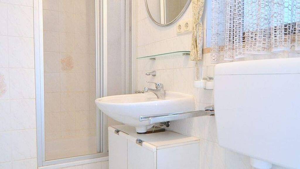 Ein eigener Zugang führt in das Duschbad, welches mit nur einem weiteren Mieter genutzt wird und über eine Dusche, Toilette und einen Unterschrank verfüft.
