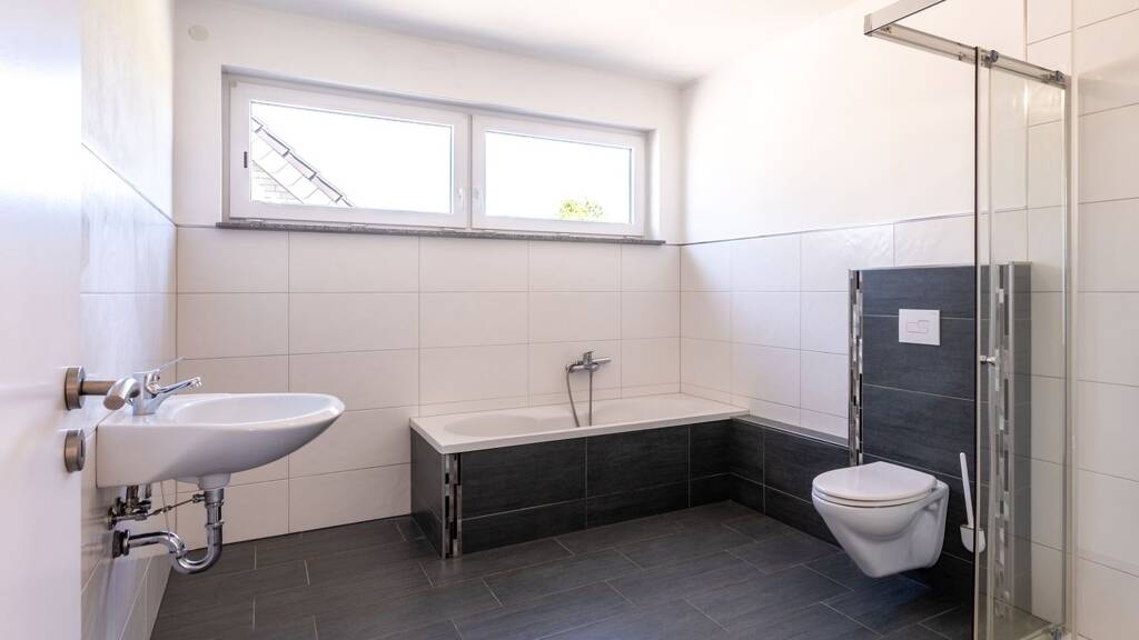 Die Wohnung im Erdgeschoss verfügt über ein großes Wohnzimmer mit offener Küche und integrierter Einbauküche, zwei Schlafzimmer sowie ein geräumiges Tageslichtbad mit Dusche, Badewanne, zwei Waschbecken und WC.