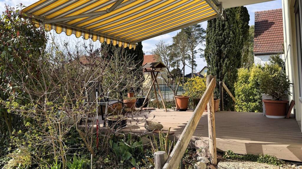 Highlight der Wohnung ist der attraktive Außenbereich: Vor der Wohnung erstreckt sich über den gesamten Vorderbereich des Hauses ein zugeordneter Gartenanteil. Mittig angeordnet liegt die große, etwa 20 m² große Südterrasse, die mit neuem WPC-Belag ausgestattet wurde. Eine Markise sorgt an sonnigen Tagen für angenehmen Schatten.