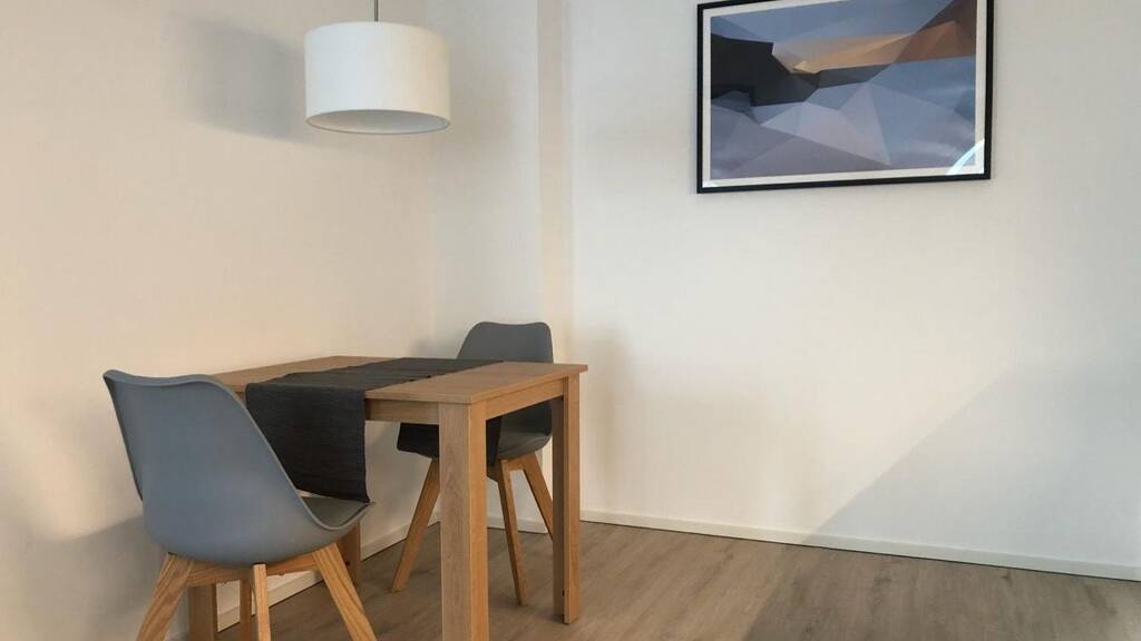 Thanks to the clever layout of the apartment and the individually adapted carpenter furniture, the 52 square meter apartment has enough space for a fully equipped kitchenette with fridge, stove, microwave incl. Grill function, a dishwasher, a dining area, a beautiful sofa area with TV, a cozy bedroom with a large wardrobe and a 160cm queen-size bed. The modern bathroom has a washing machine with integrated dryer. There is a private terrace to the quiet backyard. The high-quality furniture is stylishly arranged. The apartment is ready to move in only with a suitcase - dishes, Nespresso machine, kettle, bed linen, iron, washing machine, ironing board and towels are provided. Ample parking is available.