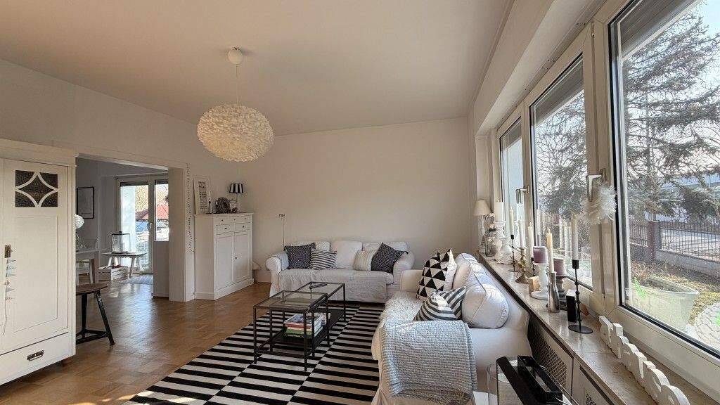 Das Erdgeschoss überzeugt durch eine klassische, durchdachte Raumaufteilung. Das geräumige Wohnzimmer mit angrenzendem Esszimmer bietet ein harmonisches Wohnambiente und direkten Zugang zur Terrasse. Beide Räume sind mit massivem Eiche-Parkett ausgestattet, das 2017 vollständig aufgearbeitet wurde und eine warme, hochwertige Ausstrahlung vermittelt. Auch der Einbau eines Kamins ist hier möglich.
