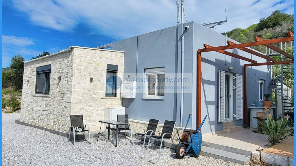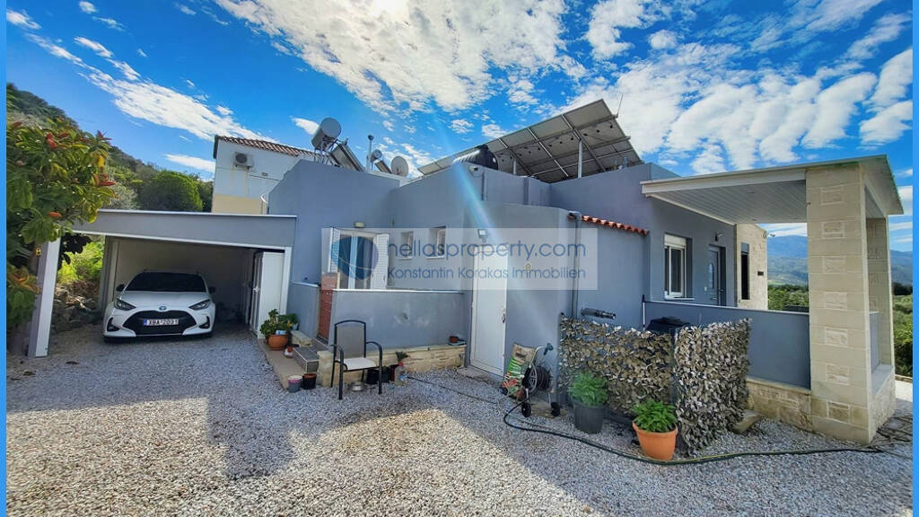 Zum Verkauf steht ein freistehendes, ebenerdiges Einfamilienhaus mit 85 m² Wohnfläche, Baujahr 2007, in der Nähe des Dorfes Exopoli oberhalb des Ferienortes Georgioupoli.