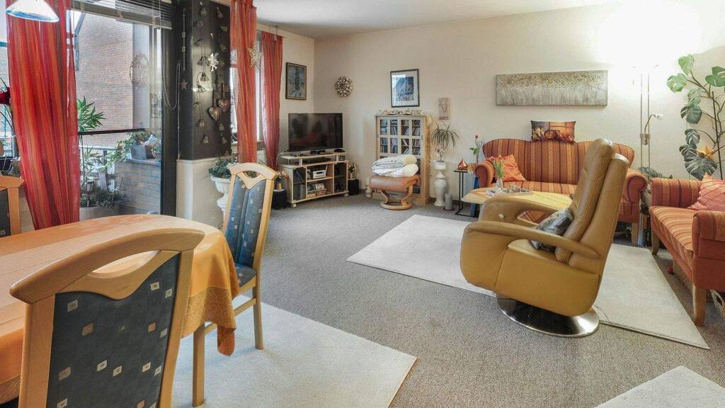 Die ca. 82,63 m² große Wohnung überzeugt durch ihre gute Raumaufteilung. Das Wohn- und Schlafzimmer bietet jeweils ausreichend Platz für eine gemütliche Wohnatmosphäre und ist wie alle Räume der Wohnung außer dem Bad und der Küche mit einem braun melierten Teppich ausgestattet. Das hell geflieste Tageslichtbad verfügt über eine Dusche sowie eine Badewanne und präsentiert sich in einem gepflegten Zustand. Der Flurbereich sorgt für einen angenehmen Eingangsbereich mit Platz für Garderobe und Stauraum.