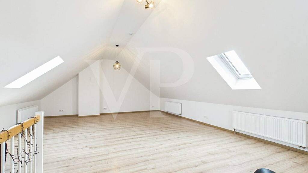 Die moderne Einbauküche ist bereits vorhanden und fügt sich harmonisch in das Gesamtbild der Wohnung ein. Neben dem Wohnbereich verfügt die Wohnung über ein Schlafzimmer sowie ein Gästezimmer. Vom Gästezimmer aus gelangt man über eine Treppe in das ausgebaute Dachgeschoss, das zusätzlichen, vielseitig nutzbaren Platz bietet und das besondere Maisonette-Flair der Wohnung unterstreicht. Das ebenerdige Duschbad ist zeitgemäß ausgestattet und bietet hohen Komfort im Alltag. Zusätzlich steht ein separates Gäste-WC zur Verfügung.