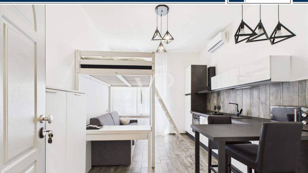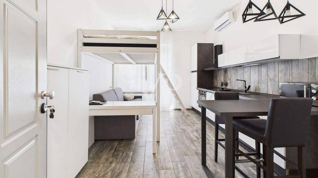Zusammensetzung: Wohnzimmer mit funktioneller und gut organisierter offener Küche; Schlafbereich mit Etagenstruktur, mit einem großen oberen Bett und einem bequemen Schlafsofa im unteren Teil, um die Räume zu optimieren und zu definieren; Badezimmer mit Fenster, Dusche und modernen Oberflächen. Neu verlegte Fußböden, renovierte Installationen und gebrauchsfertiges, modernes Mobiliar machen die Wohnung sofort bewohnbar.