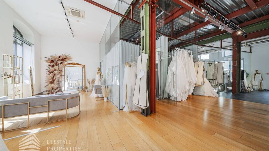 Das Geschäftslokal zeichnet sich durch die offene Raumgestaltung aus. Viele große Fenster versorgen die Räumlichkeiten mit viel Licht und präsentieren die Ware in bestem Licht. Die Küche ist mit allen notwendigen Geräten ausgestattet und verfügt über ausreichend Stauraum. Die Fotos zeigen die Räumlichkeiten, wie sie damals ausgesehen haben, als sie für Bürozwecke genutzt wurden, und wie sie im Moment aussehen.