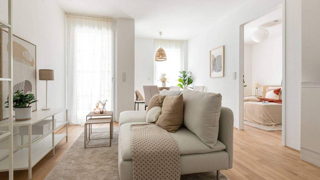 Die komfortabel konzipierten Eigentumswohnungen und Townhouses überzeugen mit vielfältigen Grundrissen und Größen, die für jede Lebensphase die perfekte Wohnlösung bieten. Feinste Eichenparkettböden und elegant ausgestattete Bäder schaffen ein Ambiente von zeitloser Eleganz und höchstem Wohnkomfort. Modernste Haustechnik sorgt für ein angenehmes Raumklima zu jeder Jahreszeit: Eine durch Fernwärme betriebene Fußbodenheizung sorgt für wohlige Wärme, während elektrisch steuerbarer Raffstores oder Rollläden Komfort und Privatsphäre auf Knopfdruck ermöglichen. In den Dachgeschosswohnungen runden hochwertige Klimaanlagen das exklusive Ausstattungspaket ab und bieten auch im Sommer ein stets erfrischendes Wohngefühl. Jede Wohneinheit verfügt über eine private Freifläche - ob Loggia, Balkon, Terrasse oder Garten - die den Wohnraum stilvoll ins Freie erweitert und einen Rückzugsort von besonderer Qualität schafft.