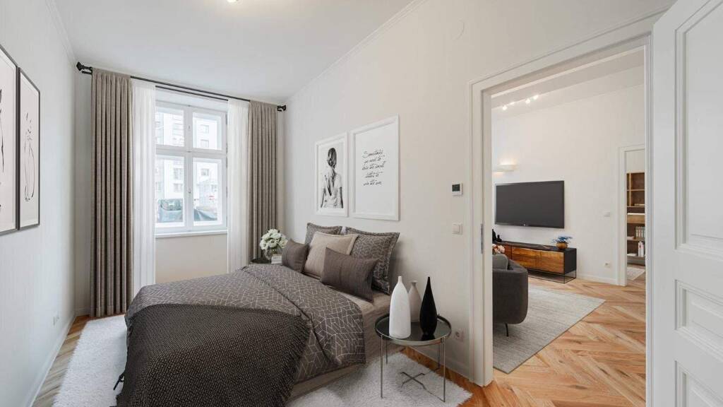 In der eben sanierten Stilaltbau-Wohnung lässt sich eine gediegene Ausstattung mit einer erlesenen Auswahl an Materialien genießen. Die Wohnung wurde mit aufwendig verlegtem Fischgrät-Eichenparkett und mit stilvollen Kassettentüren ausgestattet. Eleganter Deckenstuck und feine Vertäfelungen unterstreichen den einzigartigen Alt-Wien-Charakter. Traditionelle Holzkastenfenster, die durch moderne Isolierverglasung aufgewertet wurden zieren straßenseitig die Fassade. Das moderne Bad begeistert dank Markensanitärprodukten, einer Einbauwanne und einer Dusche mit erstklassiger Qualität, Komfort und Design.