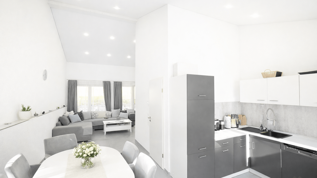 Auf rund 100 m² erwarten Sie drei gut geschnittene Zimmer. Das großzügige Wohnzimmer mit offener Küche sorgt für ein harmonisches Wohngefühl und viel Tageslicht. Das separate Schlafzimmer bietet ausreichend Platz für ein Doppelbett und einen Kleiderschrank. Das innenliegende Badezimmer ist modern, praktisch gestaltet und fügt sich stimmig in das Gesamtbild ein.
