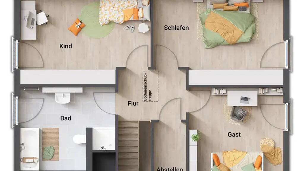 Das Mitwachshaus Flair 148 ist für alle Lebensphasen gut gerüstet. Es kann sowohl im Erdgeschoss, als auch im Dachgeschoss ein weiteres Zimmer eingeplant werden. Diesen zusätzlichen Platz können Sie bei Bedarf für ein weiteres Kinderzimmer oder ein Büro nutzen. Im Dachgeschoss gibt es weiter die Möglichkeit eine kleine Einliegerwohnung zu integrieren.