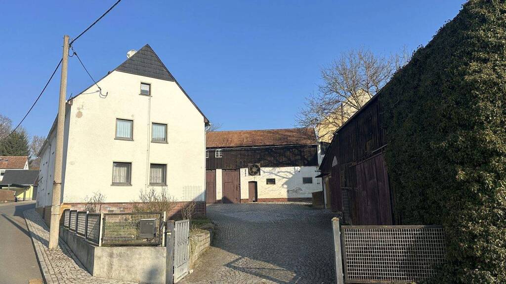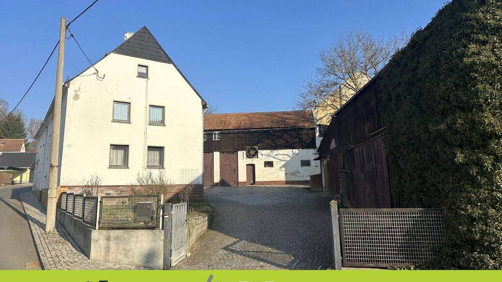 Sie mögen es ländlich, haben Platzbedarf und schätzen die Nähe zu Plauen? Dann ist dieses Anwesen für Sie genau das Richtige. Dieser 1826 erstmals erwähnte Dreiseithof mit 2 Scheunen und Garagen wird Sie begeistern. Im Erdgeschoss des Bauernhauses befinden sich eine große Küche mit Sitzecke, ein großes Wohnzimmer mit Kachelofen, ein Bad mit Dusche und WC, ein Vorratsraum sowie ein Waschhaus. Ein Brunnen mit Hauswasserwerk spart Wasser bei der Waschmaschine und Toilettenspülung. Über eine Holztreppe erreichen Sie die obere Etage, wo sich mehrere Zimmer sowie ein zweites Bad befinden. Den Spitzboden erreicht man über eine weitere Holztreppe. Hier hier hat man genügend Lagerfläche oder man baut diesen aus. Alle Räume werden derzeit über Nachtspeicheröfen beheizt und ein großer Warmwasserspeicher versorgt das Haus mit warmem Wasser. In den unteren Etagen wurden bereits ISO-Kunststofffenster verbaut, in der oberen Etage nur teilweise. Aus unserer Sicht eignet sich dieses modernisierungsbedürftige, aber in vielen Teilen sehr charmante, Bauernhaus mit ca. 150 m² Wohnfläche optimal für Familien mit Platzbedarf, Selbstversorger, Käufer die Platz für ihre Hobbys, Autos etc. suchen und natürlich Naturliebhaber und Ruhesuchende. Das Wohnhaus selbst wurde in Massivbauweise errichtet und verfügt über einen kleinen Gewölbekeller. Das Objekt ist an das öffentliche Wasser- und Abwassernetz angeschlossen. Das 2.310 m² großes Grundstück bietet ausreichend Platz zur Entfaltung, bietet derzeit 3 Einfahrten und wäre ggfls. noch weiter bebaubar. Der Innenhof ist toll mit Altstadtpflaster gestaltet. Die Scheunen und Nebengebäude bieten ausreichend Platz für z.B. eine Werkstatt (Auffahrrampe für PKW bereits vorhanden), als Lager, zum Unterstellen für alle Art von Kraftfahrzeugen, als Materiallager für Handwerker usw.. Für Dieses Objekt liegt uns ein Energiebedarfsausweis vor, gültig bis 10.06.2035. Der Energiebedarf ist mit 315,2 kWh/(m²*a) angegeben, dies entspricht der Energieeffizienzklasse H.