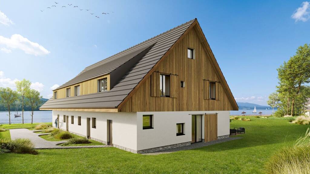 Das Gebäude wurde von einem renommierten Architekturbüro entworfen - im Einklang mit der traditionellen Sumava-Architektur und mit besonderem Fokus auf hochwertige Baustoffe. Das Erdgeschoss jeder Einheit bietet ein geräumiges Entrée und ein separates WC. Es folgt ein großzügiger Wohnbereich mit Küche, Essbereich und Zugang zu einer schönen Terrasse und Garten mit Blick auf den Lipno-Stausee. Im Dachgeschoss befinden sich zwei Schlafzimmer, ein Badezimmer und ein Abstellraum.