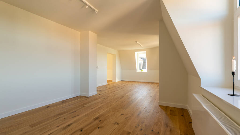 Nach Betreten der Wohnung gelangen Sie in den zentralen Flur, von welchem aus sich alle weiteren Wohnbereiche erschließen. Der Grundriss auf dieser Etage wurde im Rahmen der Sanierung angepasst, um einen offenen, klar gegliederten Wohnraum zu schaffen.
