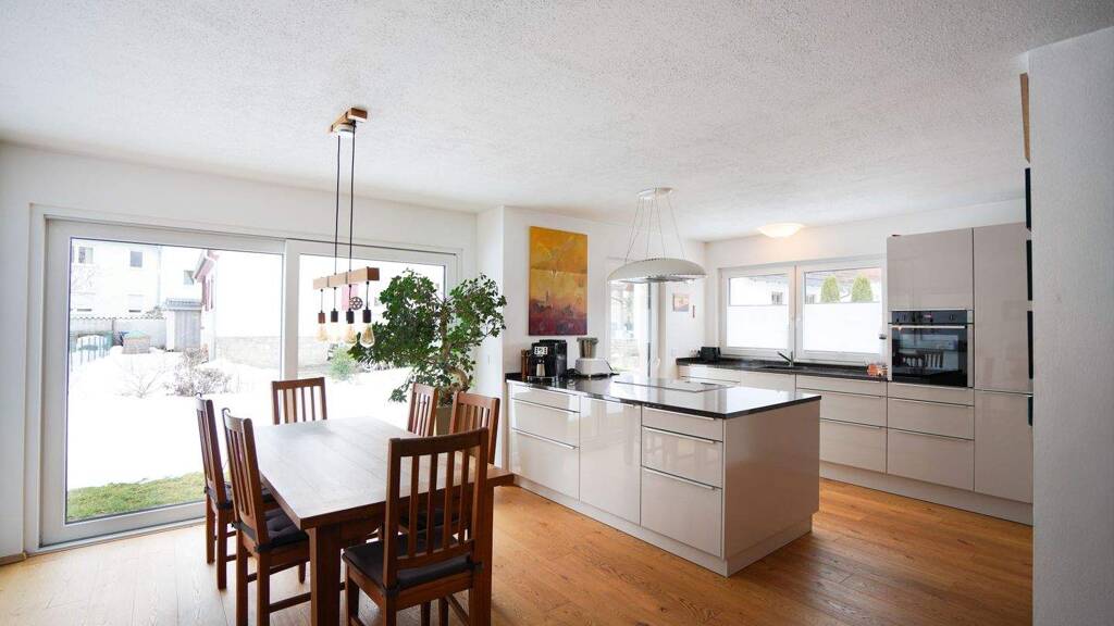 Dieser barrierefreie Bungalow aus dem Baujahr 2021 vereint modernes Wohnen, hochwertige Ausstattung und durchdachte Architektur auf einer Ebene. Das Haus befindet sich auf einem ca. 750 m² großen, liebevoll angelegten Grundstück und überzeugt durch Großzügigkeit, Komfort und klare Linien. Bereits beim Betreten des Hauses zeigt sich der hohe Anspruch an Technik und Design: Der Zugang erfolgt über eine moderne Haustür mit Fingerprint-Sensor, die Komfort und zeitgemäße Technik miteinander verbindet. Herzstück des Hauses ist der über 60 m² große Wohn- und Essbereich, der ein außergewöhnliches Raumgefühl bietet. Ein stilvoll integrierter freistehender Speicherofen in Stelenform gliedert den Raum optisch und schafft eine angenehme Trennung zwischen Wohn- und Essbereich, ohne die Offenheit zu verlieren. Hochwertiger Eichenparkettboden unterstreicht den modernen, warmen Charakter des Hauses. Die maßgefertigte Küche eines regionalen Schreiners mit edler Steinarbeitsplatte fügt sich harmonisch in den Wohnbereich ein und erfüllt hohe Ansprüche an Design und Qualität. Der private Bereich umfasst ein großzügiges Schlafzimmer mit Bad en suite, ein Büro sowie einen weiteren Raum, der flexibel abgetrennt werden kann und sich ideal als drittes Schlafzimmer oder weiteres Büro eignet. Zusätzlich steht im Eingangsbereich eine Gästetoilette mit Dusche zur Verfügung. Beide Bäder sind mit hochwertigen, dunkelgrauen Fliesen sowie modernen Regenduschen mit verschiedenen Modi ausgestattet und vermitteln ein exklusives Spa-Gefühl. Ein besonderes Highlight ist die hauseigene Sauna mit Tauchbecken, die zusätzlichen Wohnkomfort bietet. Von der Doppelgarage mit elektrischem Tor gelangen Sie trockenen Fußes direkt ins Haus – ein echter Mehrwert im Alltag. Direkt angebunden ist zudem der Hausanschluss- und Abstellraum, der zusätzlichen Stauraum und funktionale Wege schafft. Das Haus wurde in massiver Bauweise errichtet, wird über eine Gasheizung mit Fußbodenheizung beheizt. Hochwertige Holztüren eines regionalen Herstellers mit mattschwarzen Griffen setzen stilvolle Akzente im gesamten Haus. Aufgrund des Grundrisses ist das Haus ideal für Paare und kleine Familien geeignet. Der Garten ist sehr geschmackvoll und pflegeleicht angelegt, mit zahlreichen Pflanzen und viel Liebe zum Detail gestaltet – ein ruhiger Rückzugsort mit hoher Aufenthaltsqualität.