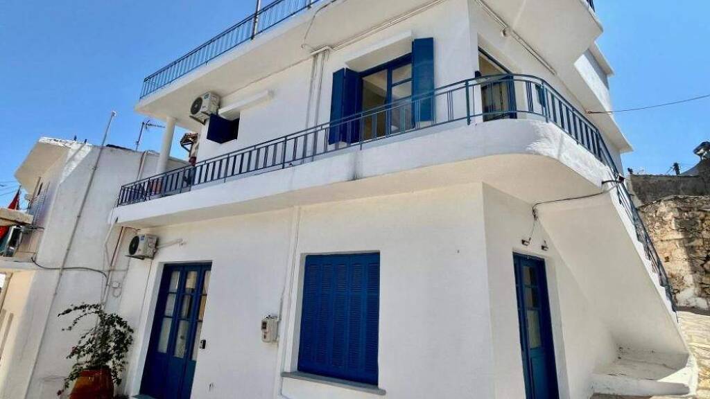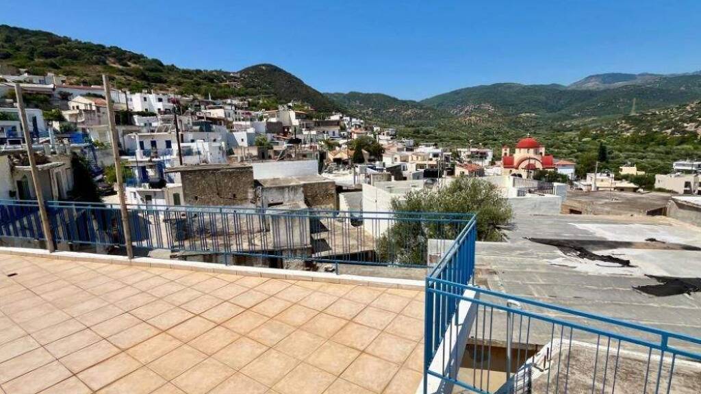 Das Anwesen mit einer Gesamtfläche von 130 Quadratmetern besteht aus zwei eigenständigen Apartments, die durchdacht mit traditionellen blauen Türen und Fenstern gestaltet sind, die authentischen kretischen Charme verleihen. Das erste Apartment befindet sich im Erdgeschoss, eine Außentreppe führt zur zweiten Wohnung im ersten Stock.