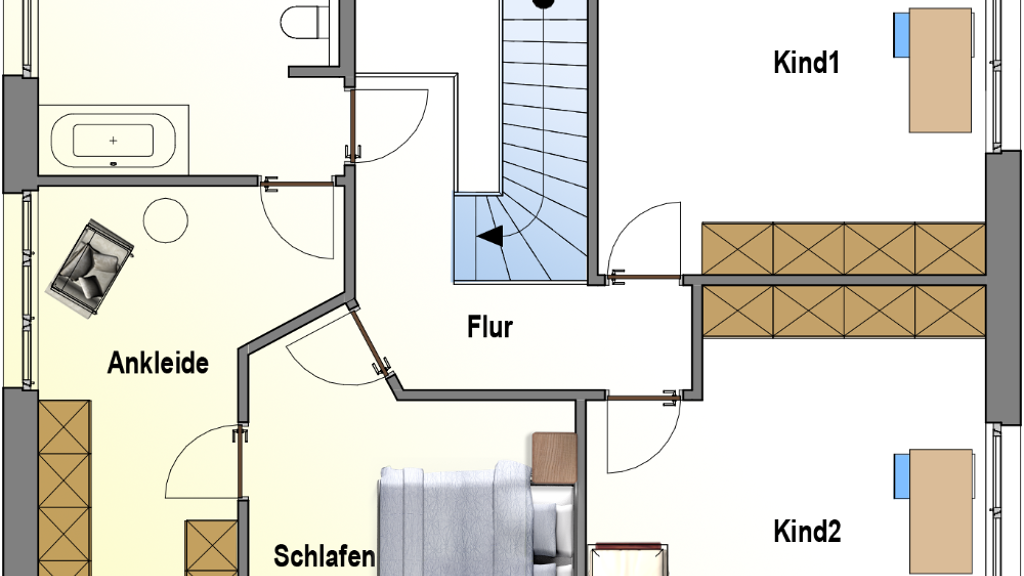 Das Dachgeschoss bietet Platz für drei Schlafzimmer und ein komfortables Badezimmer. Ihr Herz höher schlagen lässt das zusätzliche Ankleidezimmer.