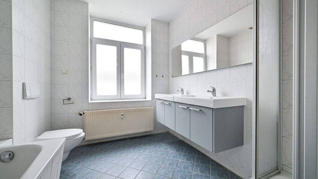 Der zentrale Flur verbindet alle Räume miteinander. Das große, helle Wohnzimmer bietet reichlich Platz für gemütliche Abende, während die geräumige Küche mit Fenster genügend Raum für einen Essbereich lässt. Das moderne Tageslichtbad ist mit einer Wanne, einer separaten Dusche und einem Waschmaschinenanschluss ausgestattet.
