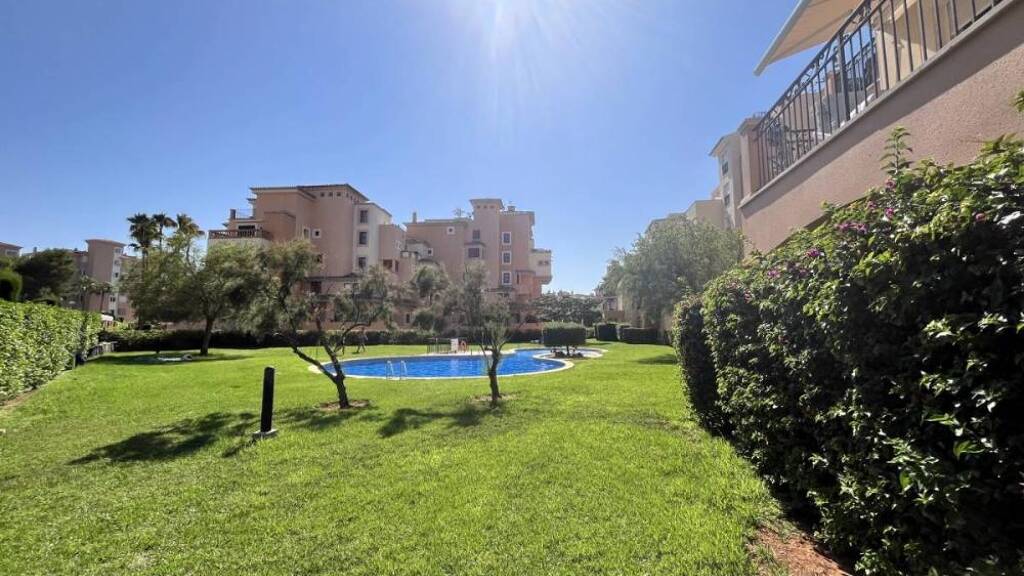 Die Wohnung verfügt über einen Eingangsbereich mit Einbauschränken, zwei Doppelschlafzimmer, ein Badezimmer und ein sonniges Wohn-Esszimmer mit Zugang zur Hauptterrasse und Veranda, separate Küche mit Waschküche und Zugang zur zweiten Terrasse. Das Apartment bietet von der Hauptterrasse aus direkten Zugang zum Gemeinschaftspool und den schönen Gärten.