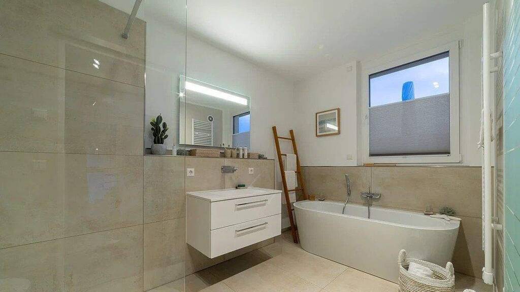 Die gehobene Ausstattung dieser Villa lässt keine Wünsche offen: Edle Bodenbeläge aus Fliesen, Laminat und Teppichboden schaffen eine harmonische Atmosphäre in jedem Raum. Fliesen sind pflegeleicht und ideal für Küchen und Bäder, während Laminat eine moderne Optik bietet und Teppichboden für Gemütlichkeit sorgt. Die umweltfreundliche Wärmepumpe sorgt für angenehme Temperaturen und senkt Ihre Energiekosten.