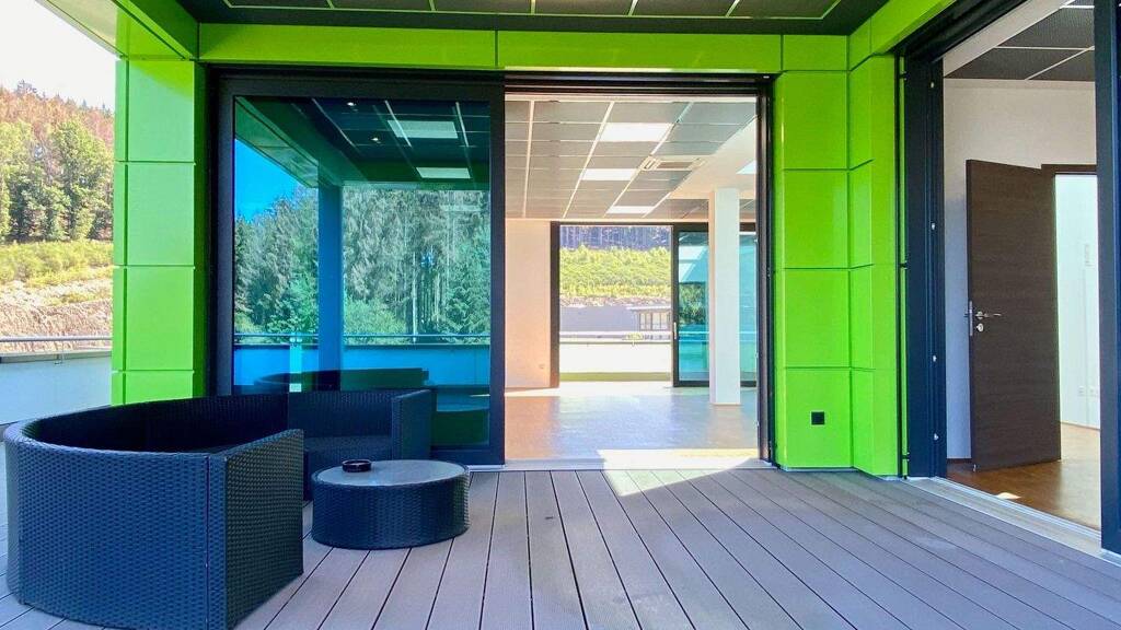 Die Immobilie ist im Staffelgeschoss der SCHNEE Fensterbau GmbH. Das erfolgreiche Familienunternehmen produziert hier hochwertige Fenster- u. Türanlagen für den deutschen und internationalen Markt.
