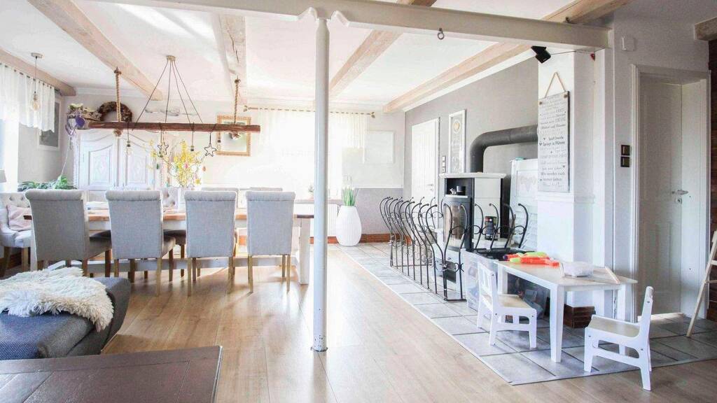 Sowohl im großzügigen Wohnraum mit Kaminofen als auch in der Küche haben Sie Platz für einen Esstisch. Im Obergeschoss finden Sie durch die drei Zimmer und den weitläufigen Bereich im Flur ein weiteres enormes Platzangebot. Im Haus liegt bereits ein Glasfaseranschluss.